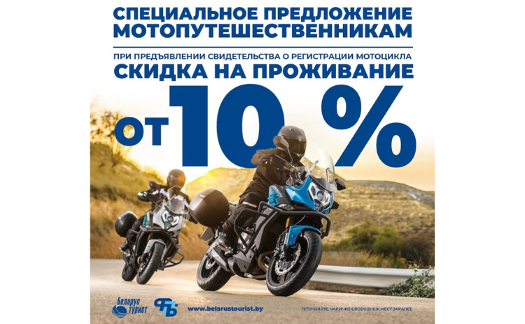 Группа отелей «Беларустурист» спешит порадовать акцией, действующей с 15 апреля по 1 октября 2026 г. для всех обладателей мотоциклов.